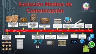 El documento proporciona una línea de tiempo que resume los principales hitos en el desarrollo de la comunicación y la tecnología de la información, incluyendo la primera señal de voz transmitida eléctricamente por Bell y Watson en 1876, el telégrafo de Samuel Morse en 1837, la primera transmisión inalámbrica de Marconi en 1895, el primer computador programable de Aiken en 1944 y el nacimiento de Internet en 1969.