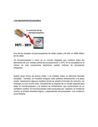 Este documento describe la evolución de los microprocesadores y las computadoras a través de las generaciones. Comenzó con el primer microprocesador comercial creado por Intel en 1971 y ha avanzado a microprocesadores modernos con millones de transistores. Las computadoras también han evolucionado de máquinas enormes que ocupaban grandes espacios en la primera generación a computadoras personales y dispositivos móviles pequeños en la actualidad.