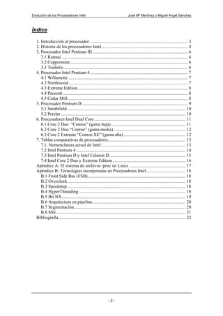 Este documento resume la evolución de los procesadores Intel desde 1971 hasta la actualidad. Comienza describiendo brevemente el procesador y su historia, luego resume las principales versiones del Pentium III, Pentium 4 y procesadores dual core más recientes. Incluye tablas comparativas y explica tecnologías clave como Hyper-Threading, SSE y multicore. El documento ofrece una visión general de casi 50 años de innovación en procesadores Intel.