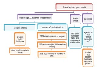 Este documento describe la evolución del turismo en América a través de varios destinos turísticos clave en Estados Unidos, Sudamérica y Brasil. Detalla la ubicación, clima, vegetación y atracciones de lugares como Atlantic City, Santa Mónica, Viña del Mar, Mar del Plata, Miami Beach, Piriápolis, Punta del Este y más. También discute el turismo en estas regiones a inicios del siglo XX y durante las guerras mundiales en destinos como Malibú, el Parque Nacional del Sud y Acapulco.