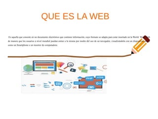 El documento resume la evolución de la web desde la versión 1.0 hasta la 5.0, describiendo las características, ventajas y desventajas de cada versión. La web 1.0 permitía solo lectura de información, mientras que versiones posteriores agregaron interactividad y contenido generado por usuarios. La web 5.0 busca mejorar la experiencia del usuario a través de imágenes dinámicas y mayor capacidad de procesamiento de datos.