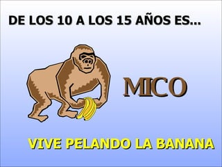 El documento describe las etapas de la evolución sexual del hombre de los 10 a los 80 años y más, comparando cada etapa con un animal y su comportamiento sexual característico, como un mono pelando plátanos a los 10-15 años, un cocodrilo comiendo todo a los 21-30 años, y una paloma solo cagando a los 81 años en adelante.