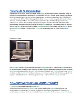 La historia de la computadora comenzó en 1642 cuando Blaise Pascal inventó una máquina para sumar números utilizando ruedas con dígitos. A lo largo de los siglos, otros inventores perfeccionaron este diseño e introdujeron tarjetas perforadas y circuitos eléctricos para procesar datos de forma más eficiente. Las primeras computadoras analógicas se construyeron en el siglo XX para resolver ecuaciones, y durante la segunda guerra mundial se usaron para guiar proyectiles. Las cinco generaciones de computadoras que siguieron se
