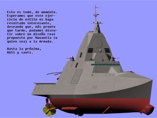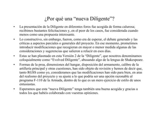 Este documento presenta la Versión 2 de un diseño conceptual para una fragata española llamada "Diligente". La versión actualizada incorpora varias modificaciones basadas en comentarios recibidos sobre la versión original, incluyendo un cambio en el diseño de la proa para mejorar la navegabilidad, el aumento del tamaño del hangar para alojar más helicópteros o drones, y el reemplazo de algunos módulos de armas por un cañón principal más grande. El documento describe estas y otras modificaciones al diseño, y