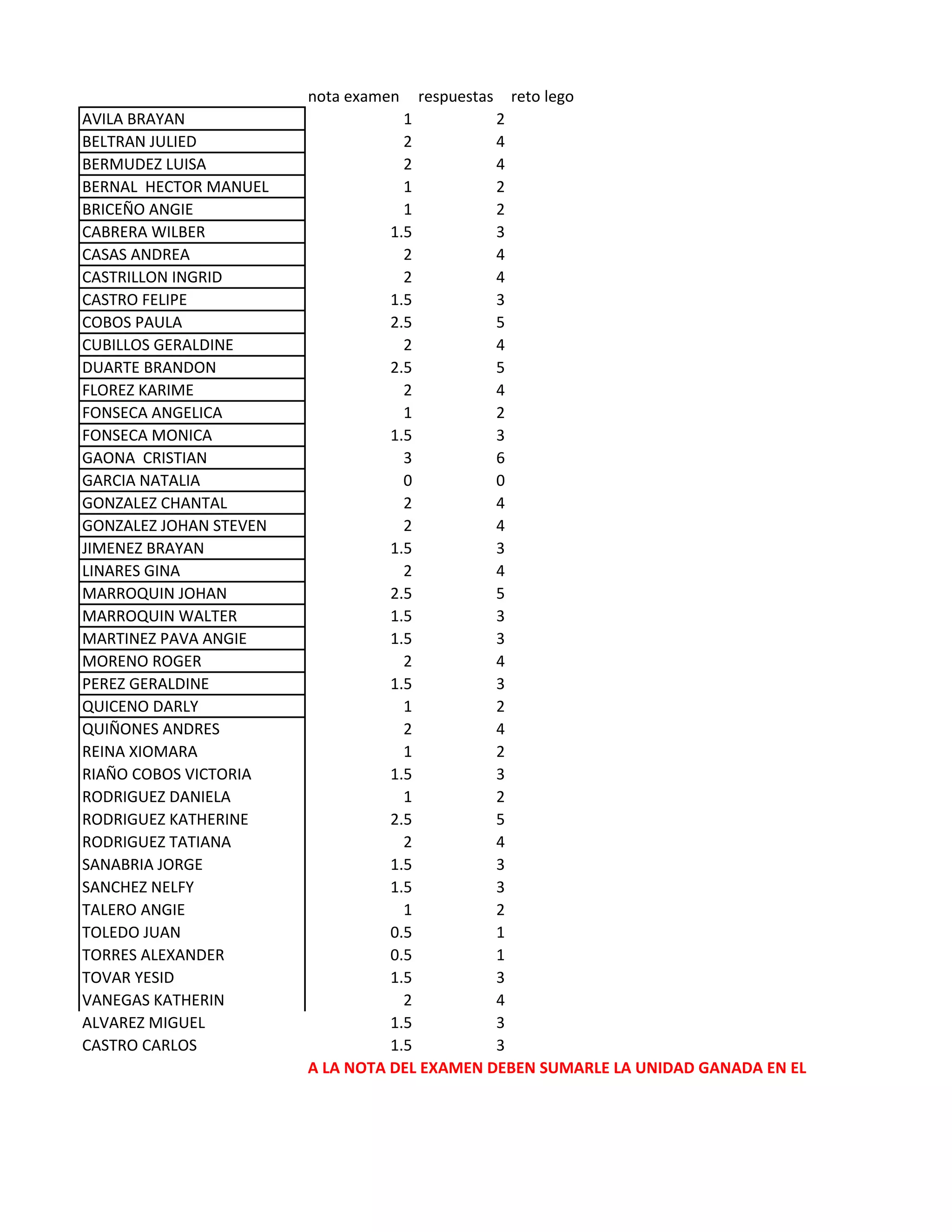 Este documento presenta las notas de un examen y las respuestas a un reto con Lego de varios estudiantes. Muestra el nombre de cada estudiante, su nota en el examen y la unidad ganada en el reto con Lego. Al final indica que a la nota del examen se le debe sumar la unidad ganada en el trabajo con Lego.