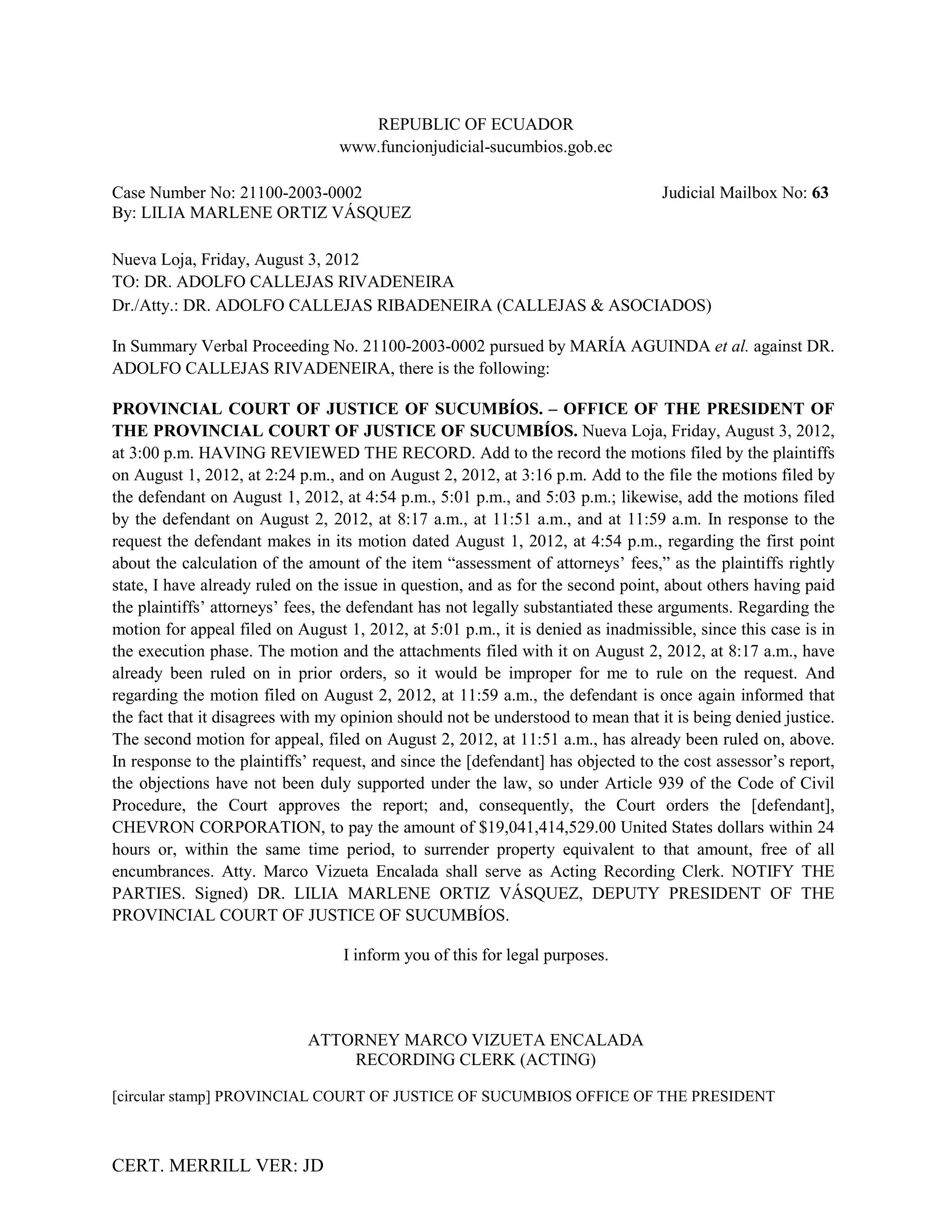 El juez Lilia Marlene Ortiz Vásquez emitió una orden en un caso judicial entre María Aguinada y otros contra Adolfo Callejas Rivadeneira. La orden aprueba el informe del liquidadora de costas y ordena a Chevron Corporation a pagar $19,041,414,529 dólares estadounidenses o entregar propiedad equivalente en un plazo de 24 horas para satisfacer la sentencia. El juez también rechazó varias mociones presentadas por la defensa.