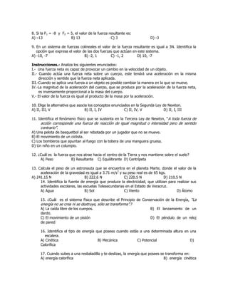 Este examen de Ciencias (Física) del segundo bimestre contiene 20 preguntas de opción múltiple sobre conceptos de fuerza, movimiento, energía y electricidad. Las preguntas evalúan la comprensión de las leyes de Newton, la gravedad, el peso, la energía potencial y cinética, las cargas eléctricas y la inducción electromagnética.