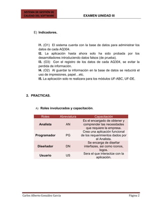 El documento describe un sistema de gestión de calidad para una aplicación web que manejará y controlará hojas de control (AQ304) para una empresa. El sistema permitirá almacenar datos de las hojas de control en una base de datos y generar reportes automáticos para evitar la pérdida de información y reducir el uso de papel. Se describen los roles involucrados como analista, programador y diseñador. También se detallan las actividades, recursos, capacitación y situaciones excepcionales para el desarrollo del sistema.