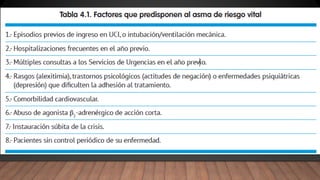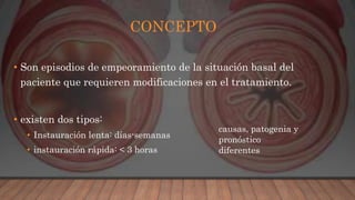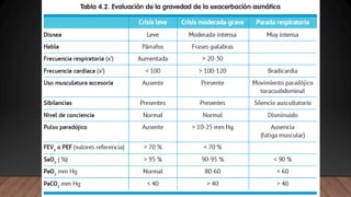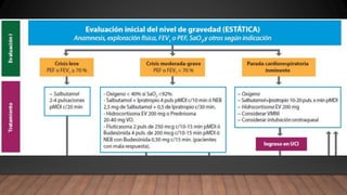 Exacerbaciones del asma pueden tener instauración lenta (días a semanas) o rápida (menos de 3 horas), causadas por infecciones, incumplimiento del tratamiento, alérgenos, o estrés. La evaluación incluye la gravedad inicial y cambios después del tratamiento. El tratamiento depende de la gravedad e incluye agonistas beta-2, glucocorticoides inhalados o sistémicos, y oxígeno. Los pacientes pueden ser hospitalizados si no mejoran después de 3 horas de tratamiento o si necesitan ox