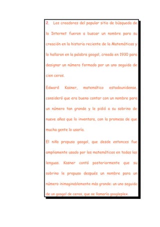 El documento explica que los creadores de Google encontraron la inspiración para el nombre de su empresa en los términos "googol" y "googleplex", acuñados por el matemático Edward Kasner para designar números extremadamente grandes. Kasner le pidió a su sobrino de nueve años que inventara un nombre para un número formado por un 1 seguido de 100 ceros, a lo que el niño propuso "googol". Más tarde, el sobrino sugirió el término "googleplex" para un número aún mayor.