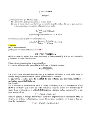 [1] El documento presenta tres problemas relacionados con cálculos de concentraciones y propiedades coligativas de soluciones. [2] El primer problema calcula la concentración molar de una solución de cloruro de aluminio. [3] El segundo problema determina la normalidad de una solución de ácido nítrico.