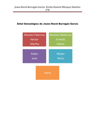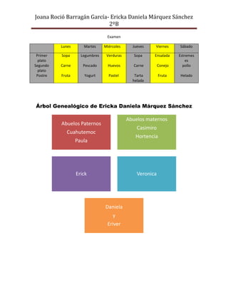 El documento presenta dos tablas. La primera tabla muestra el menú semanal de comidas de una persona, con el plato principal y postre de cada día de la semana. La segunda tabla presenta el árbol genealógico de dos personas, Ericka Daniela Márquez Sánchez y Joana Roció Barragán García, mostrando sus abuelos y padres.