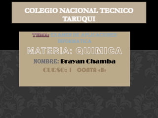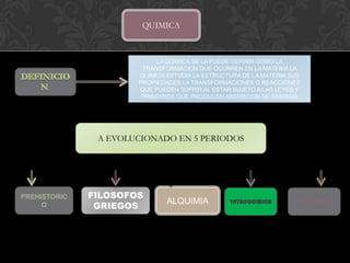La química estudia la estructura y propiedades de la materia, así como las transformaciones y reacciones que puede sufrir al estar sujeta a las leyes y principios que producen absorción de energía. La química se ha desarrollado en cinco períodos históricos y se divide en química general, inorgánica, orgánica, física y bioquímica.