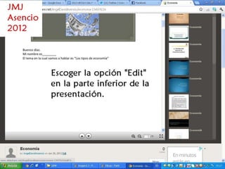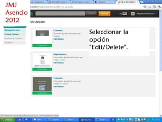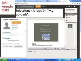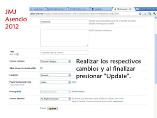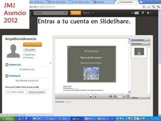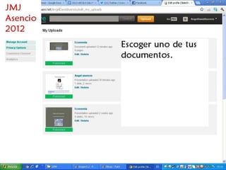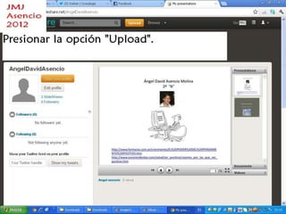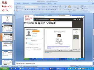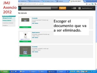 La presentación inicial incluye el nombre completo, curso y foto del estudiante, así como un chiste o cómic y enlaces a sitios web sobre pensamientos positivos. Se explica el proceso de subir una presentación a SlideShare a través de capturas de pantalla. Luego se agregan las capturas de pantalla al tema 1 y se muestra cómo actualizar un archivo en SlideShare también con capturas. Finalmente, se capturan los pasos para eliminar la presentación de SlideShare y se sube todo a Scribd.