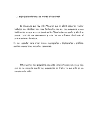 Este documento presenta un examen de computación básica 2 para estudiantes de primer año de mercadotecnia. Incluye instrucciones para crear un documento maestro con 2 subdocumentos y 3 niveles, y explica 3 formas de ingresar a Word y la importancia de estos métodos de acceso. También diferencia a Word de Office Writer, señalando que Word permite la creación de documentos de manera más rápida y fácil en español, mientras que Office Writer no puede construir documentos y sus programas están principalmente en inglés