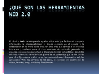 El documento habla sobre las herramientas de la Web 2.0, las cuales permiten compartir información y colaborar entre usuarios. Algunas ventajas son la interacción con múltiples docentes, control del aprendizaje, uso de materiales dinámicos y distribución de tiempos de aprendizaje. Algunas desventajas son los costos de implementación, baja velocidad con ancho de banda limitado, estudiar solo y niveles desiguales de aprendizaje.