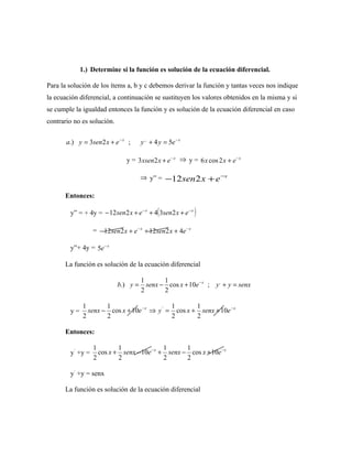 El documento describe la resolución de diversas ecuaciones diferenciales, comenzando con la verificación de soluciones mediante derivadas y sustituciones. Abarca métodos como el de variables separables y el anulador, además de abordar ecuaciones homogéneas y no homogéneas de diferentes órdenes. Incluye ejemplos detallados de cómo resolver cada tipo de ecuación, mostrando los pasos y cálculos involucrados.
