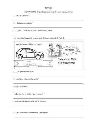 Este documento presenta un resumen de 3 oraciones o menos del contenido de un texto en español sobre las instrucciones y preguntas de una evaluación escolar de primaria en las materias de español y matemáticas. El resumen incluye la información clave sobre el tipo de texto, las materias evaluadas y el número de preguntas.