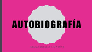 Este documento es una autobiografía de Jessica Loreley L. Díaz. Presenta información sobre su familia, incluyendo a sus padres y hermano, y describe sus primeros 10 años de vida jugando con su hermano y primos. También habla sobre sus logros académicos y deportivos a través de los años, como natación, taekwondo, capoeira y basquetbol. Actualmente tiene 17 años y estudia medicina.