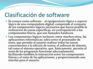 El documento clasifica tres tipos de software: software de sistema, que controla el hardware y proporciona soporte a otras aplicaciones; software de aplicación, que permite al usuario realizar tareas específicas como gestión contable o edición de textos; y software de desarrollo, que describe las distintas fases por las que pasa el desarrollo de un software, como las etapas alfa, beta y estable.