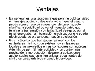 Este documento describe las ventajas y desventajas de la tecnología de transmisión. Las ventajas incluyen permitir a los usuarios ver videos y audio sin tener que descargarlos completamente, lo que permite interactuar y controlar la reproducción de manera más precisa. Las desventajas son la falta de un estándar consolidado, la necesidad de una velocidad de banda ancha superior a 28.8 Kbps para una buena calidad, y requerir software de servidor y cliente compatibles.