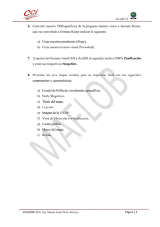 El documento presenta 8 preguntas sobre el uso del software ArcGIS 10 para georreferenciar y digitalizar mapas, crear shapefiles con atributos, importar datos de Excel, generar modelos digitales de elevación, convertir formatos y exportar mapas finales con componentes como grilla, norte magnético y leyenda.