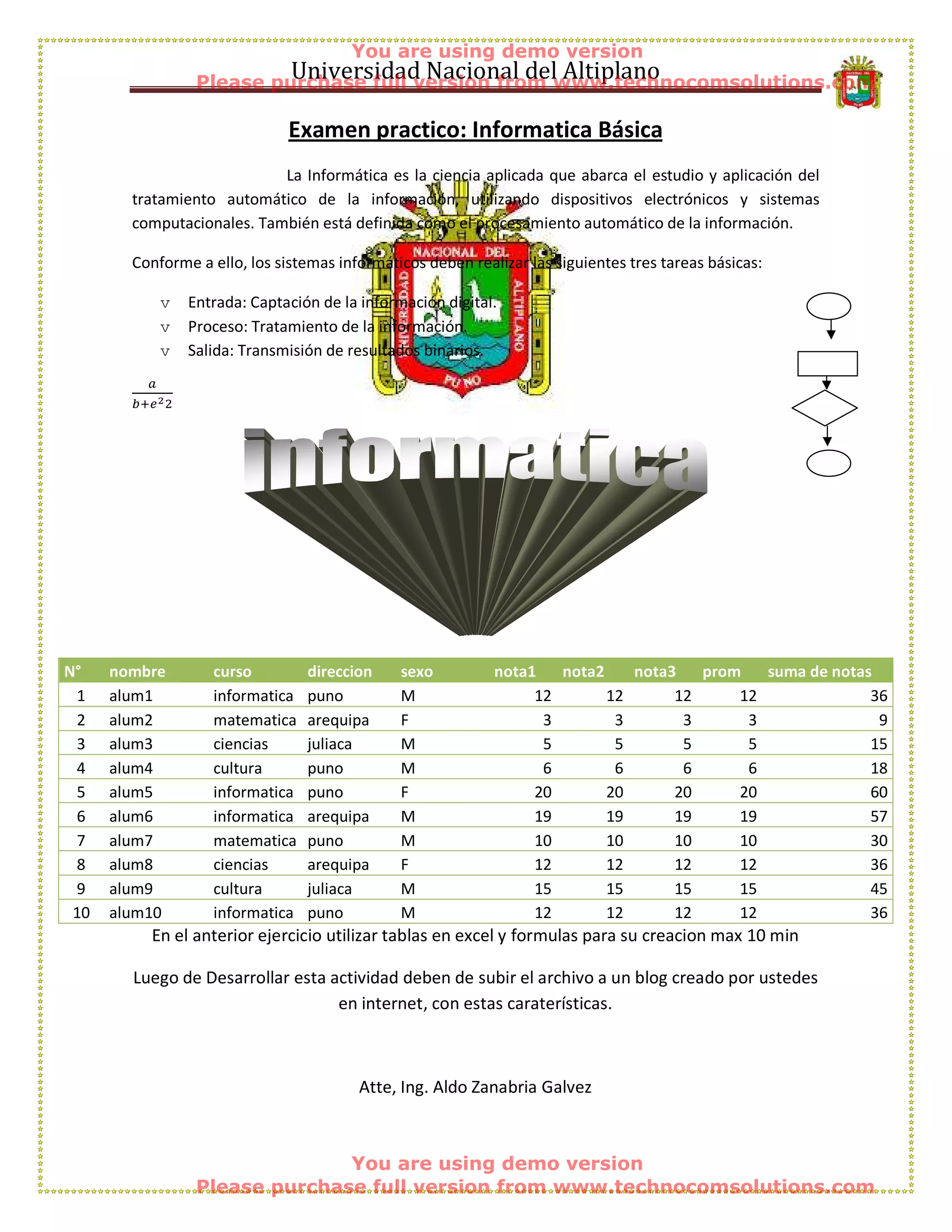 Este documento presenta un examen práctico de informática básica. Explica que la informática es la ciencia que estudia el procesamiento automático de información utilizando dispositivos electrónicos. Los sistemas informáticos deben realizar tres tareas básicas: entrada de información digital, procesamiento de información, y transmisión de resultados. Luego presenta una tabla de ejemplo con datos de estudiantes y sus notas para ser creada en Excel.