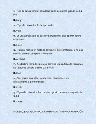 El documento presenta una lista de 15 preguntas sobre tipos de datos y conceptos de programación orientada a objetos. Para cada pregunta se proporciona la respuesta correcta, identificando diferentes tipos de datos simples como boolean, char, short, byte, int, float, double, long y void, así como conceptos como clase, abstract, final y público.