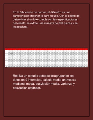Este documento presenta los resultados de un estudio estadístico realizado sobre una muestra de 300 pernos para determinar si cumplen con las especificaciones del cliente. Se agruparon los datos de diámetro de los pernos en 9 intervalos y se calcularon medidas como la media, moda, desviación estándar y varianza. Se incluyen tablas y gráficas como histograma, caja y bigotes, ojiva y radial que muestran la distribución de frecuencias. La conclusión es que la estadística es importante para la calidad de los