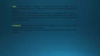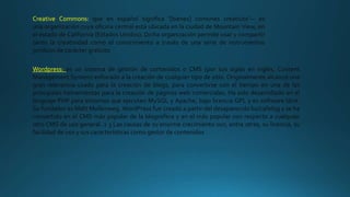 Los tags son comandos que dan forma a las páginas web y empiezan con "<" y terminan con ">". Una categoría es un grupo básico para clasificar conocimiento o una jerarquía en una profesión. Creative Commons permite compartir creatividad y conocimiento a través de acuerdos legales gratuitos. Wordpress es un sistema para crear sitios web, especialmente blogs, de forma gratuita y con código abierto. Un blog es un sitio que recopila artículos cronológicamente para establecer un diálogo entre lectores y autores.