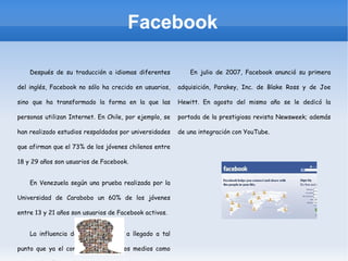 Facebook fue creado por Mark Zuckerberg y otros estudiantes de Harvard como un sitio para la universidad, pero ahora está abierto a cualquier persona con una cuenta de correo. Más de 500 millones de usuarios usan Facebook para conectarse con amigos, ver fotos, jugar juegos y usar aplicaciones. Facebook se ha convertido en una de las páginas web más populares a nivel mundial y ha cambiado la forma en que las personas usan Internet.
