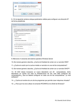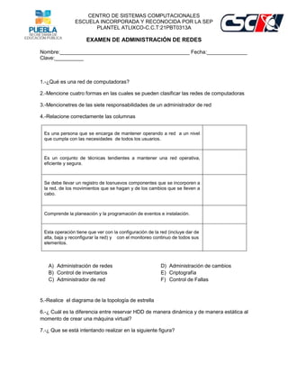 Este documento presenta un examen de administración de redes que consta de 15 preguntas. Algunas de las preguntas tratan sobre las responsabilidades de un administrador de red, formas de clasificar redes, componentes de una red como servidores DNS y DHCP, y herramientas de configuración de red como IPCONFIG. El examen evalúa los conocimientos básicos sobre administración y configuración de redes.