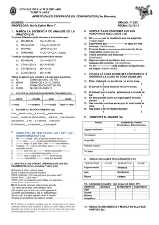 Este documento presenta los aprendizajes esperados en comunicación para el tercer bimestre de primer grado. Incluye ejercicios sobre análisis de oraciones, uso de homófonos, puntuación con comas y completar cuadros con frases, sustantivos, verbos y pronombres. También contiene ejercicios sobre géneros literarios y la redacción de una noticia.