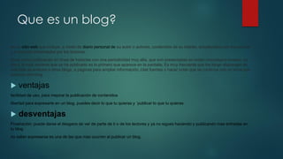 Un blog es un sitio web que funciona como un diario personal en línea actualizado frecuentemente por su autor con contenidos de su interés y que permite comentarios de lectores. Los blogs presentan historias de forma cronológica inversa y suelen incluir enlaces a otros blogs y páginas relacionadas.