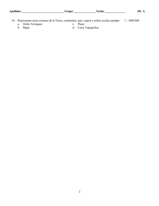 Este documento presenta un examen de 10 preguntas sobre conceptos básicos de geografía terrestre como la rotación y movimiento de la Tierra, representaciones gráficas como mapas, globos terráqueos y cartas topográficas, y sus características. El estudiante debe seleccionar la respuesta correcta para cada pregunta multiple choice u opcion verdadero/falso.