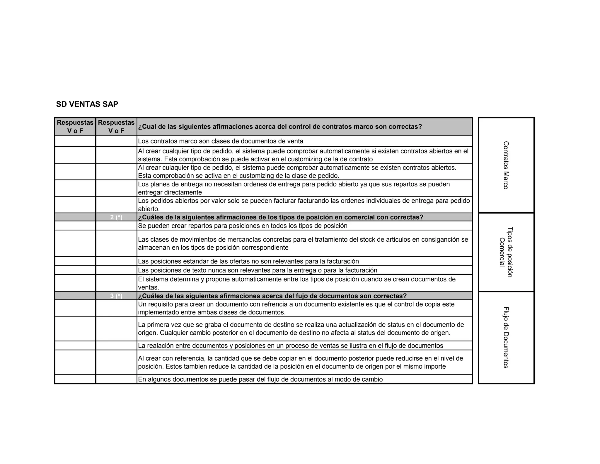 Este documento proporciona información sobre varios temas relacionados con los procesos de ventas en SAP, incluyendo contratos marco, tipos de posición, flujo de documentos, entregas gratuitas, listas de materiales de ventas y tipos de documentos de ventas. Responde preguntas múltiples selección sobre cada uno de estos temas.