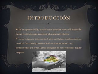 El documento presenta el plan de las 5 erres ecológicas (reutilizar, reducir, reparar, regular y reciclar) para cuidar el planeta. Explica cada una de las 5 erres, incluyendo ejemplos de su aplicación. También describe los diferentes contenedores de reciclaje por color y los tipos de materiales que va en cada uno, así como la diferencia entre reutilizar y reciclar. Concluye que aunque hay esfuerzos por cuidar el planeta, estos pueden ser opacados por la maldad humana.