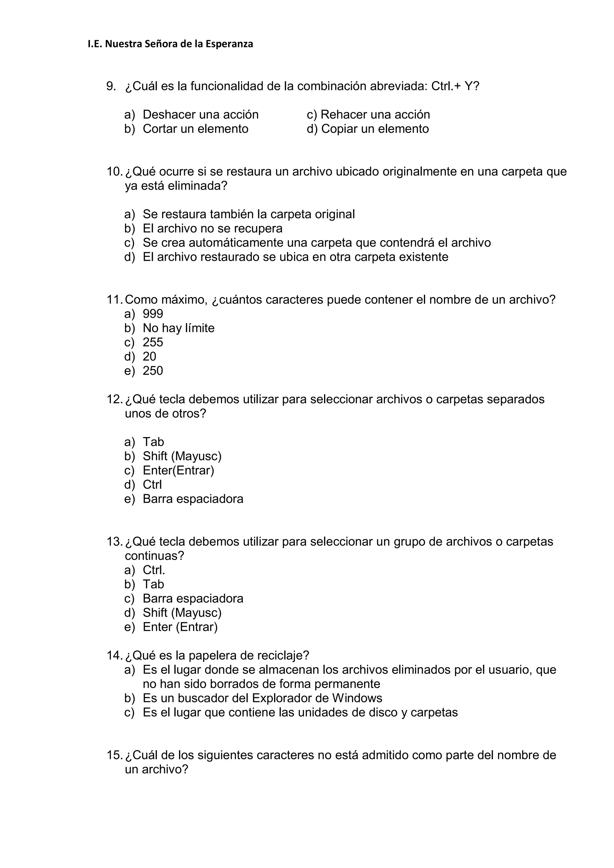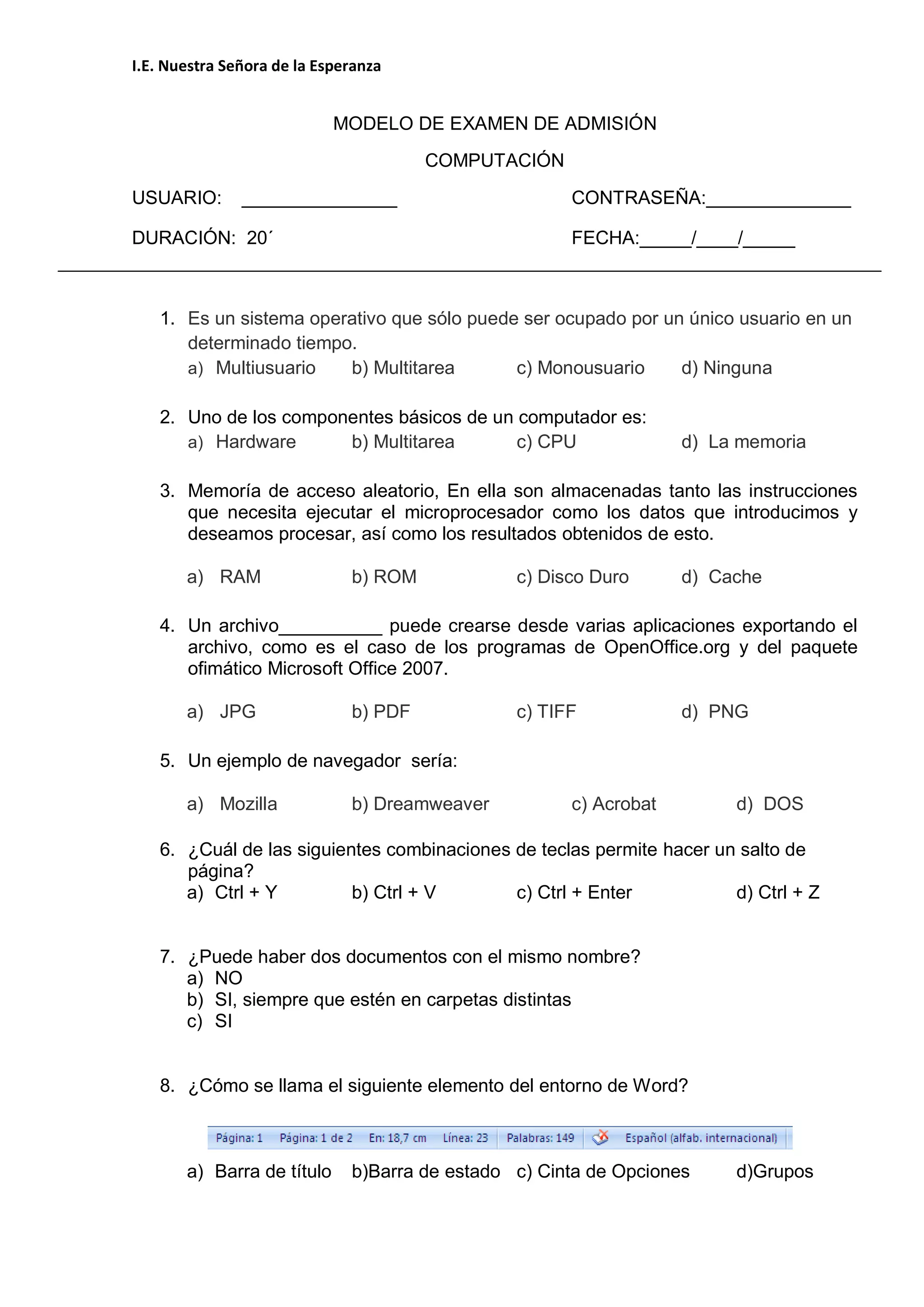 Este documento presenta un examen de admisión de computación que consta de 15 preguntas de opción múltiple sobre temas como sistemas operativos, hardware, software y conceptos básicos de computación. Algunas de las preguntas tratan sobre componentes de hardware como la CPU y la memoria RAM, sistemas operativos monousuario, formatos de archivos como PDF, navegadores web como Mozilla y funciones básicas de programas de oficina como Word.