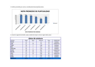 El documento presenta un análisis de datos sobre notas promedio de puntualidad de diferentes carreras profesionales. Incluye tablas con datos, cálculos de promedios, y gráficos de barras para visualizar y comparar los resultados. Adicionalmente, presenta tablas ordenadas con datos de estatura y peso de varias personas.