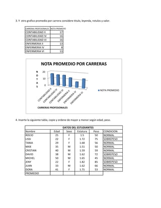 Este documento presenta un resumen de las evaluaciones de procesos de ofimática realizadas por Carmen Nuñez Vilchez. Incluye tablas con datos de notas promedio de estudiantes por mes y carrera, así como una tabla con datos de estudiantes ordenados por edad y peso. También incluye gráficos de barras para visualizar los promedios por mes y por carrera. Finalmente, presenta una tabla con formato de celda y números.