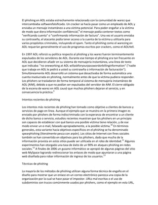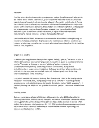 El documento habla sobre el phishing. Explica que el phishing es un tipo de estafa cibernética donde los estafadores se hacen pasar por empresas confiables para robar información personal y financiera de las víctimas. Describe las diferentes técnicas que usan los phishers como enviar correos electrónicos falsos o usar sitios web engañosos. También explica cómo se originó el término phishing y los daños que causa esta práctica.