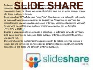 El documento presenta varias herramientas y plataformas digitales para compartir y crear contenido en línea como SlideShare, Hot Potatoes, CmapTools, Blogger, redes sociales (Facebook, Hi5, Bebo, Sonico, Myspace) y YouTube. También describe plataformas para compartir documentos como Scribd y pizarras interactivas como SmartBoard.