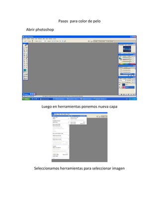 Para cambiar el color de pelo en Photoshop, se crea una nueva capa y se selecciona la imagen con la barita para pintar el cabello. Luego se cambia el color seleccionado y se guarda la imagen con el nuevo color de pelo.