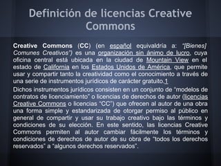 Creative Commons es una organización sin fines de lucro que ofrece licencias gratuitas para permitir que la creatividad y el conocimiento se compartan y usen. Las licencias Creative Commons son contratos de licenciamiento que permiten a los autores cambiar fácilmente los términos de derechos de autor de su obra de "todos los derechos reservados" a "algunos derechos reservados". Existen cuatro tipos principales de licencias Creative Commons que permiten diferentes niveles de uso no comercial, atribución, y creación de obras derivadas.