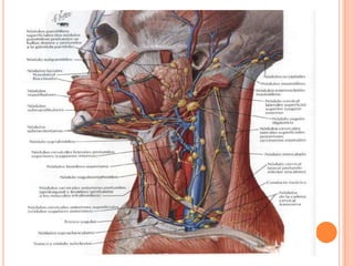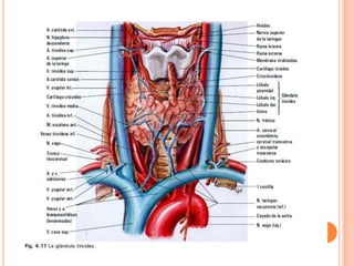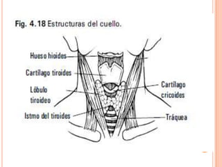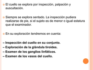 El documento proporciona instrucciones detalladas para examinar el cuello a través de la inspección, palpación y auscultación. Se describe la exploración de la glándula tiroides, los ganglios linfáticos del cuello y los vasos del cuello. Se explican las técnicas específicas para inspeccionar y palpar la glándula tiroides y los ganglios linfáticos de manera sistemática.