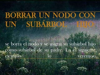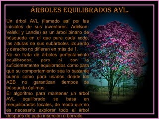Este documento resume información sobre estructuras de datos lineales y no lineales como listas, colas, árboles y árboles binarios de búsqueda. Explica conceptos como nodos, raíz, hojas, niveles e inserción y eliminación de elementos. También describe los diferentes tipos de recorridos como preorden, inorden y postorden para recorrer completamente un árbol.