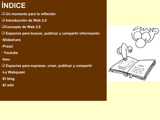 Este documento presenta diferentes herramientas de la Web 2.0 que pueden utilizarse en el aula, como SlideShare, Issuu, YouTube, blogs, wikis y webquests. Explica brevemente qué son cada una de estas herramientas y cómo pueden usarse tanto por los profesores como por los estudiantes para buscar, publicar y compartir información e ideas de manera colaborativa.