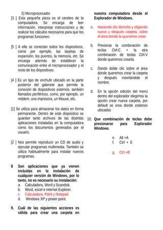 Este documento presenta un examen de evaluación del primer módulo de un curso de informática básica para un estudiante llamado Carlos Camones Luna. El examen contiene 10 preguntas de opción múltiple sobre conceptos básicos de hardware, software y Windows como la barra de tareas, el explorador, la carpeta "Mis documentos" y otros. El estudiante también debe realizar algunas tareas prácticas como cambiar nombres de accesos directos, buscar archivos por extensión y crear carpetas y archivos.