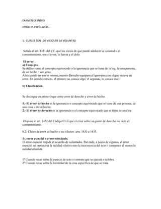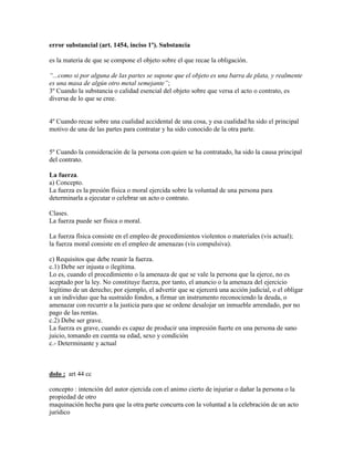 1. El documento resume los vicios de la voluntad, incluyendo el error, la fuerza y el dolo. 2. Explica las diferentes clases de error como el error de hecho y el error de derecho. 3. También cubre las resoluciones judiciales que producen efecto de cosa juzgada, como las sentencias definitivas e interlocutorias.