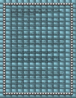 El documento discute varios temas relacionados con la neurociencia y el aprendizaje. Explica que la memoria es una función cerebral que permite codificar, almacenar y recuperar información, mientras que el conocimiento se inicia a través de los sentidos. También describe diferentes estilos de aprendizaje según Bandura, Ausubel, Novak, Piaget y Vigotsky, e identifica la memoria visual, auditiva y kinestésica con ejemplos.